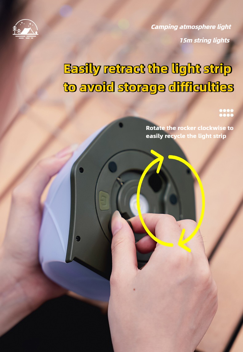 The KXK-505 camping light is equipped with 65 SMD lamp beads and 1 XTE lamp bead, as well as a 15-meter long yellow + color (RGB) light string, providing a luminous flux of 90-220 lumens. Whether it is providing warm lighting in the tent or creating an atmosphere outdoors, it can meet the needs.